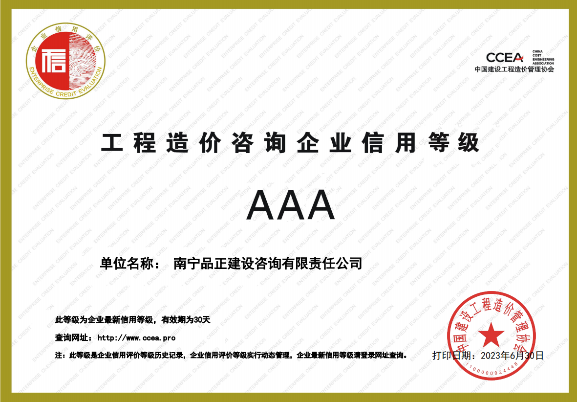 2023年3月至6月,南寧品正建設(shè)咨詢有限責(zé)任公司參加中國建設(shè)工程造價(jià)管理協(xié)會(huì)組織的2023年第一批工程造價(jià)咨詢企業(yè)信用評(píng)價(jià),順利通過初評(píng)、終評(píng),榮獲中國建設(shè)工程造價(jià)管理協(xié)會(huì)最高等級(jí)AAA級(jí)信用等級(jí)(中價(jià)協(xié)〔2023〕40號(hào)文),我公司自2017年以來,已經(jīng)連續(xù)6年獲此殊榮。