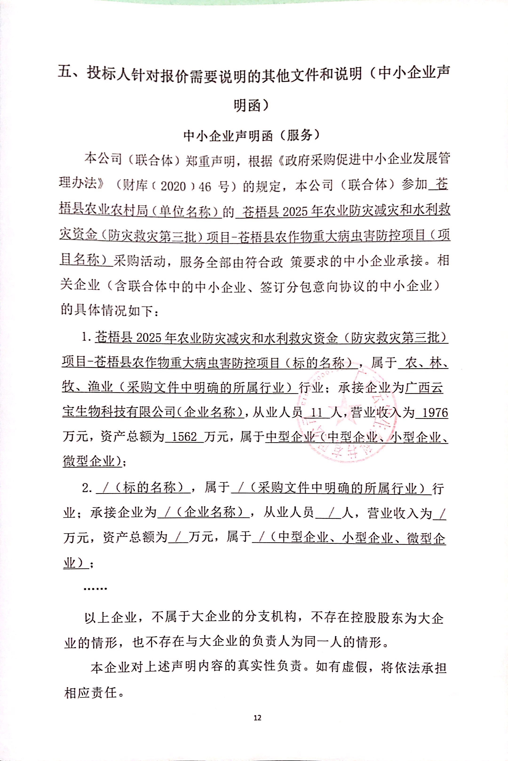 1 | 蒼梧縣2025年農(nóng)業(yè)防災(zāi)減災(zāi)和水利救災(zāi)資金(防災(zāi)救災(zāi)第三批)項(xiàng)目-蒼梧縣農(nóng)作物重大病蟲害防控項(xiàng)目 | 詳見競(jìng)爭(zhēng)性談判文件和響應(yīng)文件內(nèi)容。 | 合同簽訂后 5 個(gè)工作日內(nèi)供貨,并在 20 個(gè)工作日內(nèi)完成項(xiàng)目內(nèi)容 | 1.國家強(qiáng)制性標(biāo)準(zhǔn)及有關(guān)規(guī)定。 2.競(jìng)爭(zhēng)性談判采購文件的采購需求及成交供應(yīng)商響應(yīng)文件響應(yīng)的事項(xiàng)。 3.為確保貨物質(zhì)量避免假冒偽劣產(chǎn)品,供應(yīng)商必須在供貨時(shí)提供生產(chǎn)廠家針對(duì)此項(xiàng)目的售后服務(wù)保證函原件、供貨證明原件并加蓋生產(chǎn)廠家公章。 4.按以上列明需要提供證書、截圖、文件等資料一并提交我方后才可確認(rèn)驗(yàn)收,不提供或提交不全的不予確認(rèn)。 |