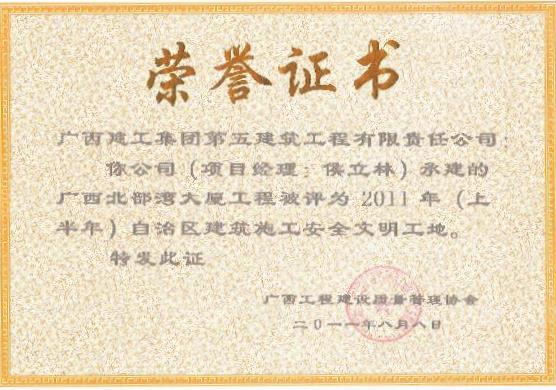 廣西北部灣大廈工程被評(píng)為2011年(上半年)自治區(qū)建筑施工安全文明工地榮譽(yù)證書
