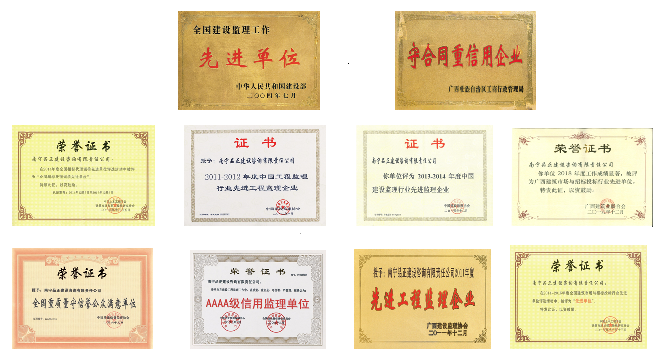 經(jīng)過十幾年的錘煉,積淀了“南寧品正”獨具特色的企業(yè)文化,成功地締造了“南寧品正”品牌。南寧品正是“全國工程監(jiān)理先進單位”、“全國監(jiān)理行業(yè)安全管理先進單位”、“全國重質(zhì)量守信譽公眾滿意單位”、“全國AAAA級資信示范監(jiān)理單位”、“廣西誠信企業(yè)”、“廣西守合同重信用企業(yè)”。在廣西建設(shè)監(jiān)理協(xié)會和南寧市建設(shè)監(jiān)理協(xié)會組織的歷次評選中,均被評為“廣西先進工程監(jiān)理企業(yè)”、“南寧市先進監(jiān)理單位”,連續(xù)多年被評為南寧市城鄉(xiāng)建設(shè)系統(tǒng)“先進單位”、“先進基層黨組織”、“宣傳工作先進單位”,并被評為“南寧市先進單位”。公司所承擔監(jiān)理和實施項目管理的工程項目共獲得數(shù)十項國家、省部級、自治區(qū)和市級獎項。